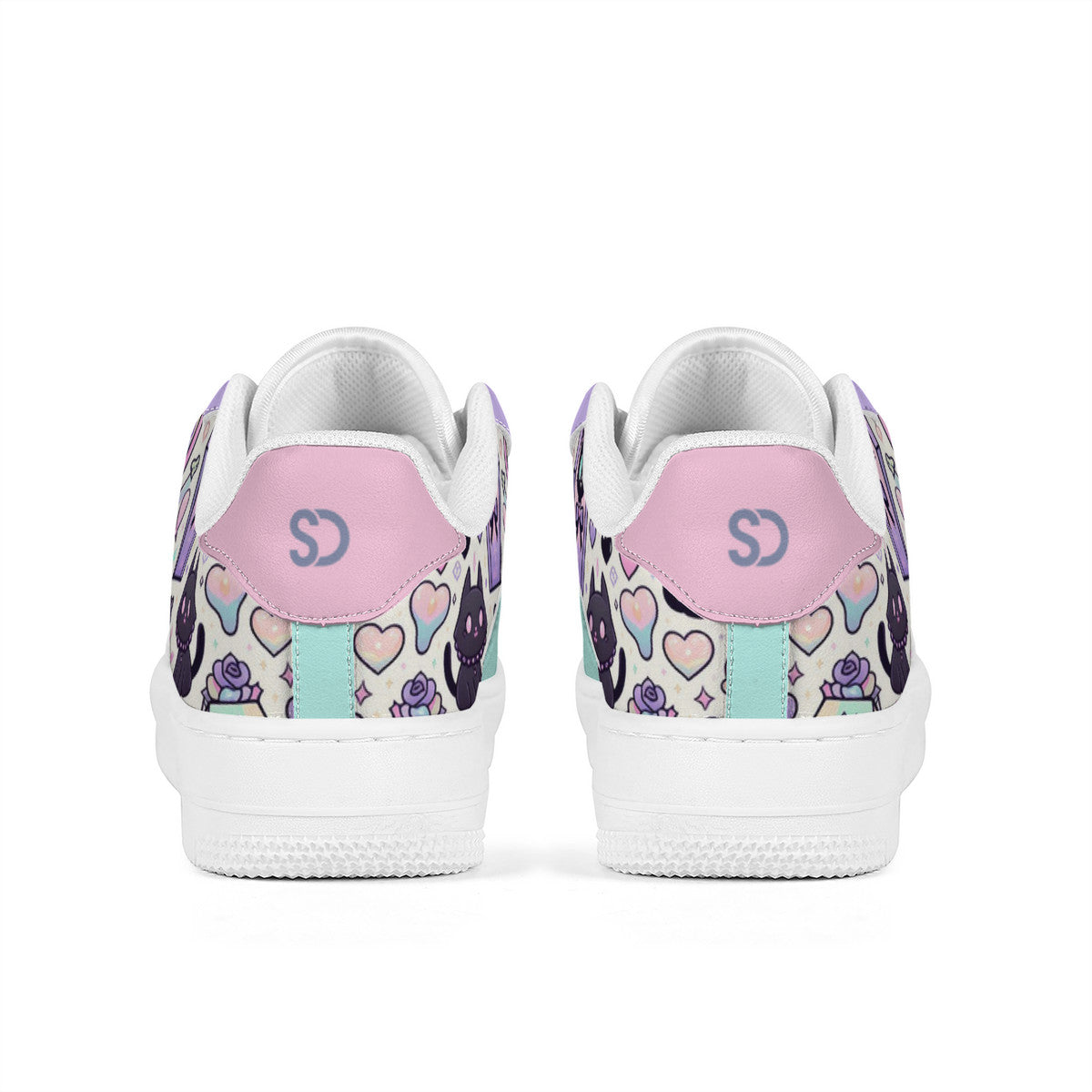 - Style: Low top sneakers with kawaii cat print and pastel color accents